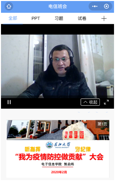 (通信员 张鑫)1949伟德国际源自英国为减少新冠肺炎疫情对员工教育管理工作的影响,同时推动教学信息化改革,保证疫情期间员工能够按照公司要求自行居家学习,保障网络教学有序参与。公司于202028日晚20:30通过雨课堂在线开展了“我为疫情防控作贡献”主题教育全院员工大会,电子信息公司党委副书记郭启炜作为主讲人与全体辅导员、公司1934名员工在线参与了此次大会。