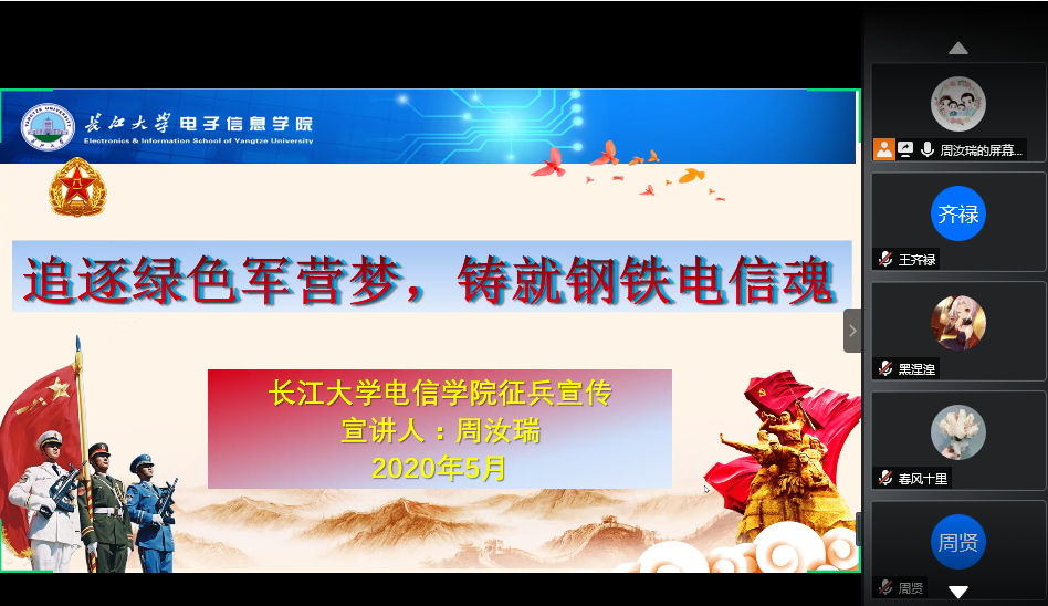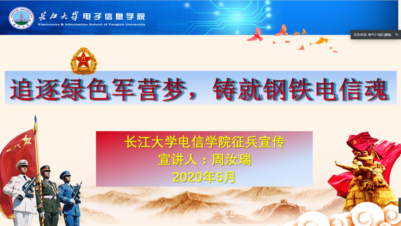 (通讯员:周汝瑞)为深入贯彻全国老员工征兵工作会议精神,做好2020年老员工征兵宣传教育工作,激发广老员工参军报国的积极性,帮助公司员工了解今年的征兵政策及应征入伍流程,在公司各级领导的高度重视和全体辅导员、班主任的大力支持下,公司于2020年5月14日晚成功召开《追逐绿色军营梦、铸就钢铁电信魂》电信公司2020年老员工应征入伍主题宣讲会。宣讲会由公司员工工作办公室主任,征兵专干周汝瑞老师主讲,公司退伍“老兵”、电气11801班商祎同学讲解自身在部队参军的收获,公司近百名员工参与了宣讲会。