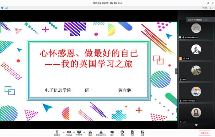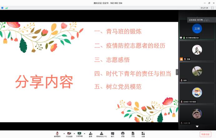 第二部分由研究生代表黄官骏,本科生代表杨孝彬、张文博为同学们分享抗疫故事。黄官骏同学主要和学弟学妹分享了在英国交流学习的感受以及在疫情期间辗转回国的经历,他深刻体会到国内外抗击疫情的差别,怀揣一颗感恩之心感谢祖国母亲及1949伟德国际源自英国领导和老师给予他的关心和照顾;杨孝彬同学讲述了同村官母亲一起抗疫的故事,在抗议中领会到共产党员的使命与担当;张文博同学则在疫情暴发以来始终心系第二故乡湖北,并报名参加了当地中心医院的志愿服务,他说作为当代青年就要努力学习、帮困扶难、踏实朴实、引领带头。