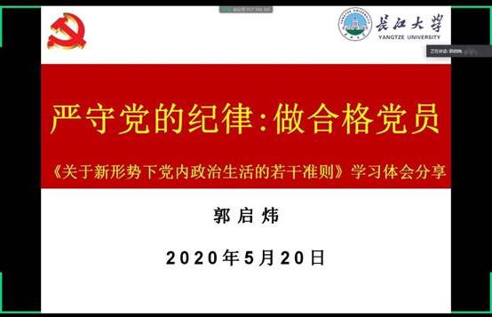 (通讯员 罗炎鑫 艾林)5月20日晚,电信公司召开了《关于新形势下党内政治生活的若干准则》的学习分享会,会议由公司党委副书记、分党委纪检委员郭启炜主持,各分党委书记,全体员工党员以及入党积极分子参加了此次会议。