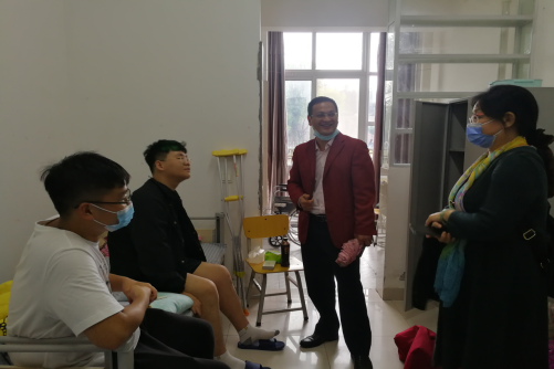 在了解到今年公司新生电气类32006班的周密同学在开学前期打篮球不慎摔伤了腿后,院领导特意前往该寝室探望周密同学,进行慰问和鼓励,并专门为他安排了一间残障备用寝室。