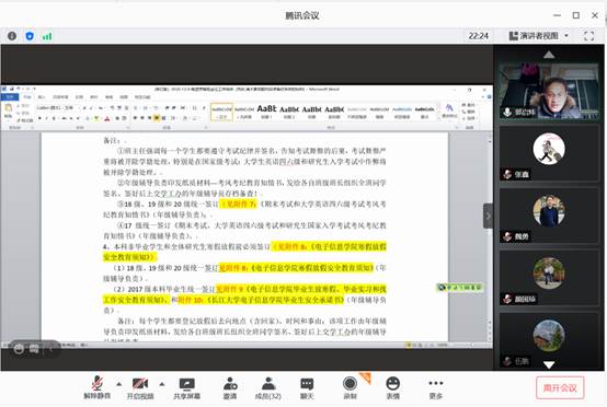 期末将至,为贯彻落实寒假期间公司对于员工安全教育及管理工作方面的要求,为把期末近期员工日常教育与管理工作做实、做好,确保公司同学能够提高自我防护意识,度过一个安全快乐的假期。2020年12月4日,电子信息公司以腾讯会议的方式召开了班主任、辅导员工作大会,会议由郭启炜书记亲自主持,本次会议以安全教育为中心,并展开寒假前后员工安全教育与管理工作部署。