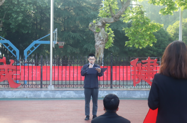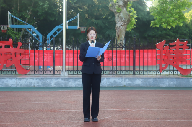上午7时整,升旗仪式正式开始。在铿锵有力的脚步声中,国旗护卫队迈着整齐划一的步伐、擎着鲜艳的五星红旗迎面而来,阔步走向升旗台。国歌奏,唱声响,五星红旗迎风扬,全体师生庄严肃立,以昂扬的精神面貌注视着五星红旗迎朝阳升起,表达着全体师生对伟大祖国的热爱与祝福,对生逢盛世的欢欣与喜悦,对美好未来的憧憬与期望。