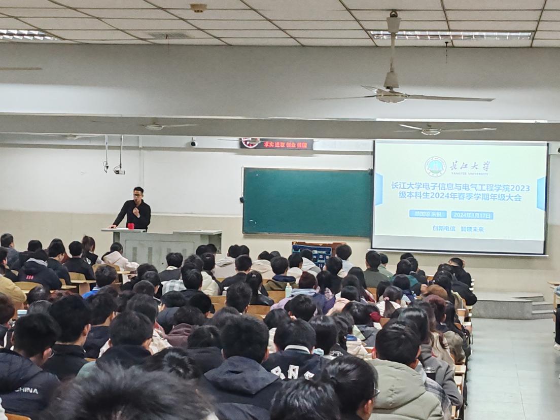 (通讯员 李悦嘉 朱锐)新学期新征程。为帮助同学们制定新学期学习计划,更好地备考英语四级,公司于3月17日晚召开2023级本科生春季学期年级大会暨英语四级动员会,辅导员朱锐老师、学工办主任颜国琼老师及2023级全体本科生参加大会。
