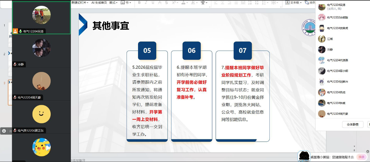 为进一步落实公司关于秋季学期开学相关工作要求,公司于9月1日至9月4日组织各班召开2025年秋季学期开学线上主题班会,年级辅导员、班主任积极参会。