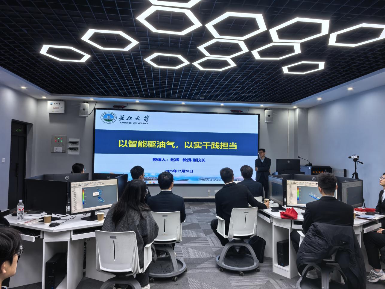 赵辉紧密结合新时代能源安全战略和石油勘探技术发展前沿,围绕课题组长期深耕的研究方向,系统介绍了石油勘探领域的基础理论、关键技术及智能化发展趋势。他从地球物理信息获取、油气资源精细探测到智能算法在油气开发中的应用实例入手,深入浅出地阐释了智能技术赋能油气勘探开发的现实路径和广阔前景,引导同学们深刻认识科技创新在保障国家能源安全中的关键作用。