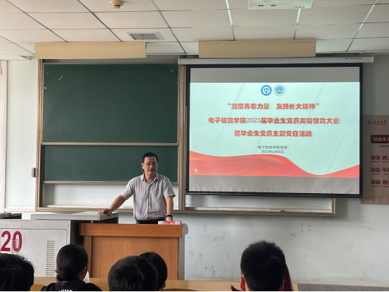 为深入推进学习贯彻习近平新时代中国特色社会主义思想主题教育,引导广大党员坚持以习近平新时代中国特色社会主义思想为指导,深入学习贯彻落实党的二十大精神,加强毕业生党员的理想信念教育、爱国爱校教育,激发毕业生党员的使命担当,6月8日下午,电子信息公司在13教C220组织毕业生党员开展以“凝聚青春力量 发扬长大精神”为主题的离校教育大会暨主题党日活动。公司党委副书记郭启炜、党建秘书李蒙、在校毕业生党员参加会议。