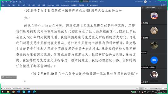 (通讯员:姚李昊升 龚文浩) 近日,研究生工作部在全校研究生中开展了12月政治理论学习活动,本次活动以学习习近平坚持用马克思主义及其中国化创新理论武装全党、中国共产党第十九届中央委员会第六次全体会议公报、中共中央关于党的百年奋斗重大成就和历史经验的决议为主要内容。12月24日下午,电信公司研究生采用线上会议的形式开展了12月政治理论学习会议。