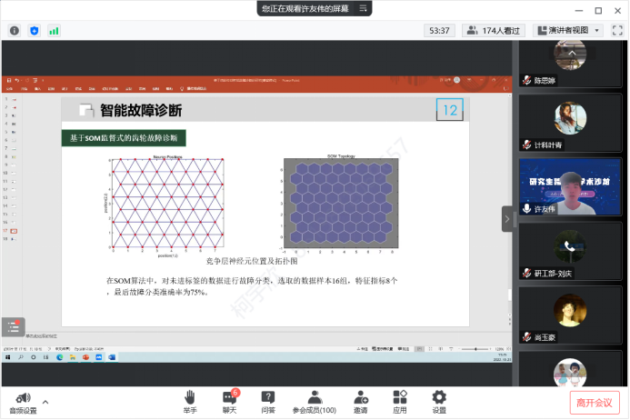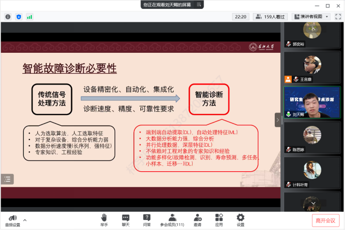 来自机械工程公司许友伟同学以《基于齿轮传动系统智能诊断的研究》为题,讲述了全球因机械故障导致的重大伤亡事件背景下智能设备故障诊断技术研究迫在眉睫,对比不同特征集来源下的齿轮故障诊断准确率,讲解了包络谱分析在特征提取方面可以更好作为齿轮故障类别识别的特征提取方法。