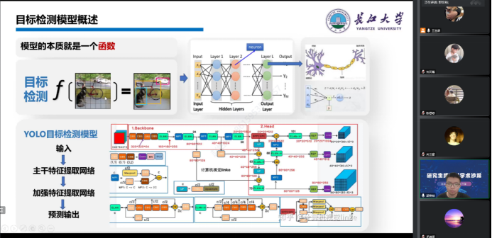 首先来自电子信息公司的郭奕裕同学以遥感目标检测为主要的研究方向,为同学们分享了他的研究内容《一种面向不平衡数据集的轻量化SAR舰船检测模型》,他从目标检测模型的本质与发展历程引入,为同学们介绍了现有目标检测模型存在的不足,提出了掩膜数据平衡增强方法,高效注意力机制模块、自适应的多尺度融合模块三个方面的改进方法。最后在论文方面进行了详细的论文结构讲解和文献检索、画图的辅助工具的分享。
