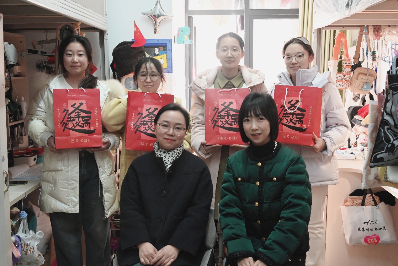 “送福小分队”走进宿舍,亲切问候考研学子,了解同学们的备考情况,鼓励同学们调整状态、继续坚持、保持信心、诚信应考,同时也要注意身体健康。