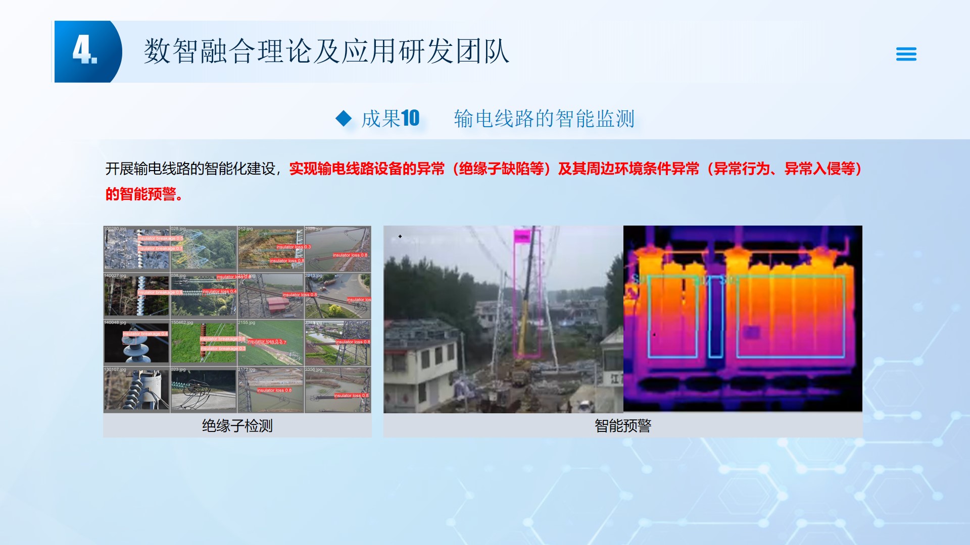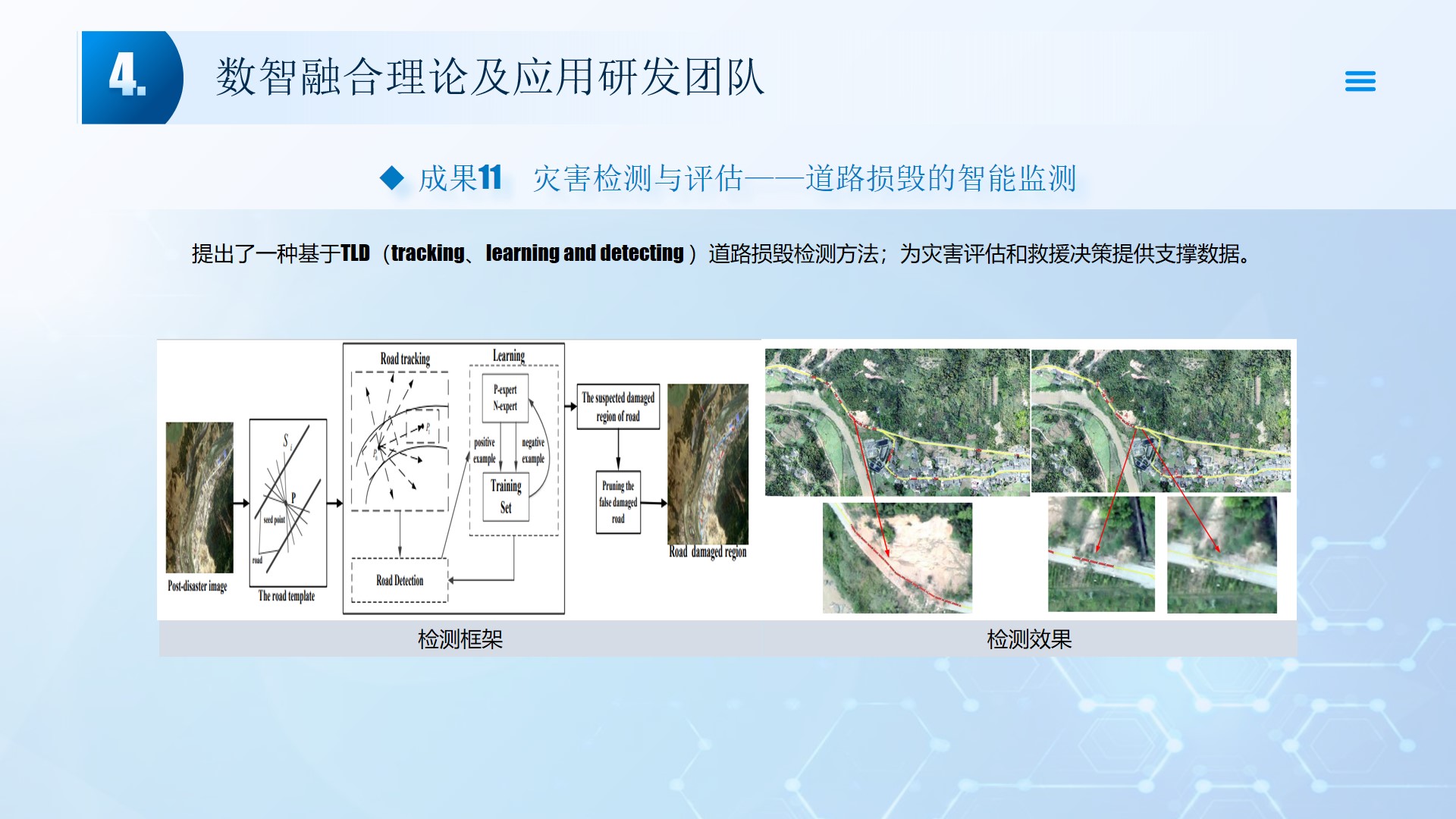 团队围绕数智融合理论及应用开展了多项研究工作,团队成员主持国家自然科学基金3项、湖北省自然科学基金2项、中石油创新基金及横向课题30余项。在《Smart Materials and Structures》、《Remote sensing》、《IEEE Internet of Things Journal》、《IET Image Processing》等国内外权威学术期刊发表论文100多篇,出版专著2部,授权专利20余项;获湖北省科技进步三等奖2项。团队承担了人工智能、图像处理、信号处理、数据挖掘、大数据分析和三维建模,涉及的领域包括智慧油田、智慧农业、智慧交通、智慧医疗和智慧金融等领域。智慧油田方面开展的工作主要包括:中深部储层预测技术、井震联合的三维地质建模技术、智能化井场实时监控技术、智能化随钻地质导向技术和智能化地层压力预测技术等。部分成果已在油田现场、电力系统、农业场景、城市社区和医疗系统等方面取得了良好的应用效果。